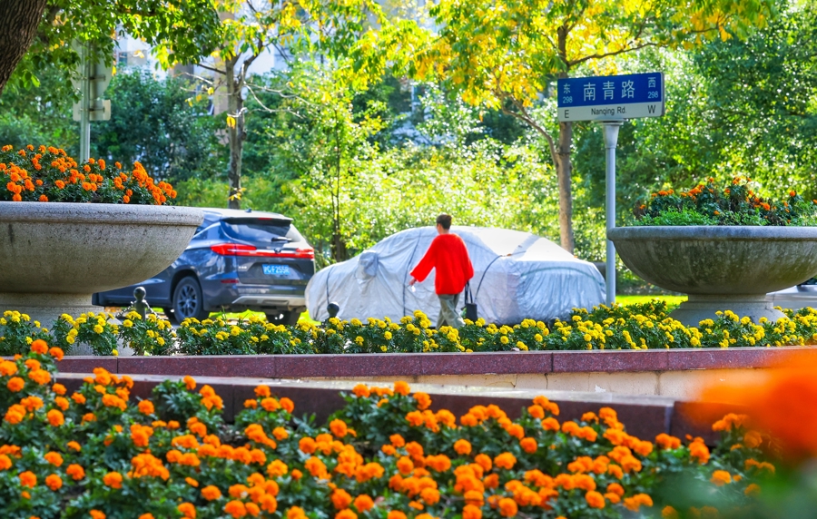 市民或驻足拍照,或静坐赏景,在都市喧嚣中邂逅一抹静谧的秋意。