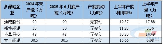 截至6月底,四家多晶硅企业合计硅料总产能达198.5万吨,同比增加31万吨,较2024年底产能持平,2025年1-6月尚未有新增产能释放。