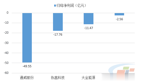 其中,通威股份亏损额49.55亿元,继续位居首位,占到60%,其次协鑫科技亏损17.76亿元,大全能源亏损11.47亿元,新特能源亏损2.56亿元。除新特能源同比减亏外,其余三家亏损额均增加。